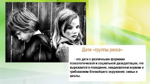Отличительной особенностью детей «группы риска» является то, что формально, юридически они могут считаться детьми, не требующими особых подходов (у них есть семья, родители, они посещают обычное общеобразовательное учреждение), но фактически, в силу различных причин, не зависящих от них самих, эти дети оказываются в ситуации, когда их базовые права не реализуются в полной мере или вообще попираются - право на уровень жизни, необходимый для их полноценного развития, и право на образование и др. Сами дети своими силами не могут разрешить эти проблемы. Они или не могут их осознать, или не видят выхода из трудной жизненной ситуации, в которой оказались. При этом дети «группы риска» не только испытывают воздействие негативных факторов, но очень часто не находят помощи и сочувствия со стороны окружающих, тогда как оказанное в нужный момент внимание могло бы поддержать ребенка, помочь ему преодолеть трудности, изменить мировоззрение, ценностные ориентации, понимание смысла жизни и стать нормальным гражданином, человеком, личностью.