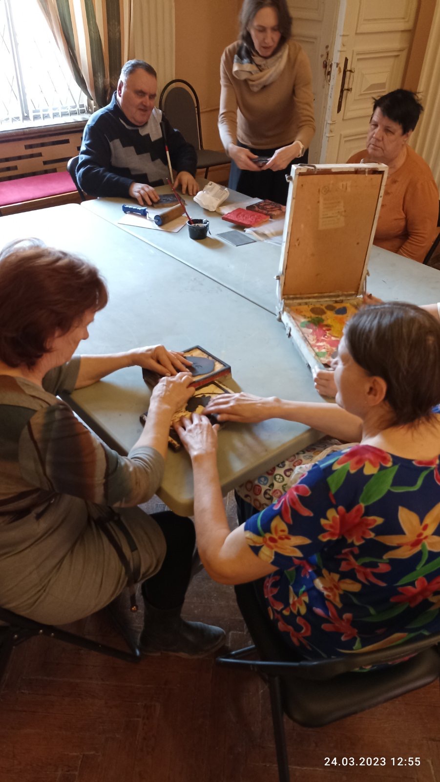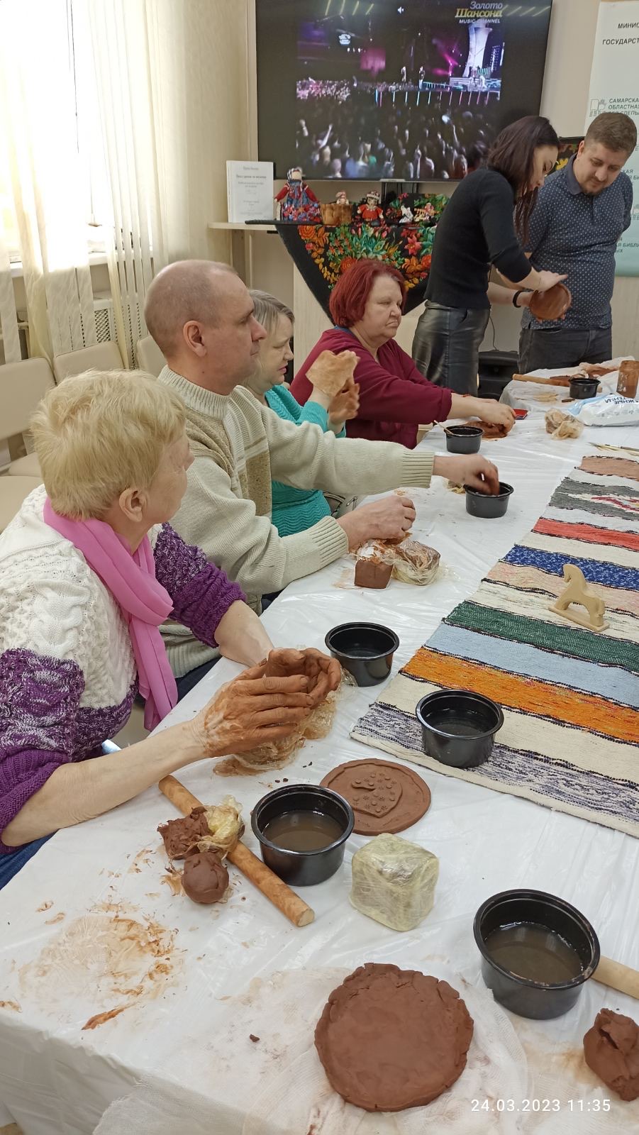 В библиотеке незрячих гостей ждал мастер-класс из цикла "Уроки ремесла", подготовленный Светланой Дмитриевной Степановой в рамках Года педагога и наставника. Участники узнали о разнообразии народных промыслов, под руководством сотрудников библиотеки сделали расписные тарелочки из глины.
