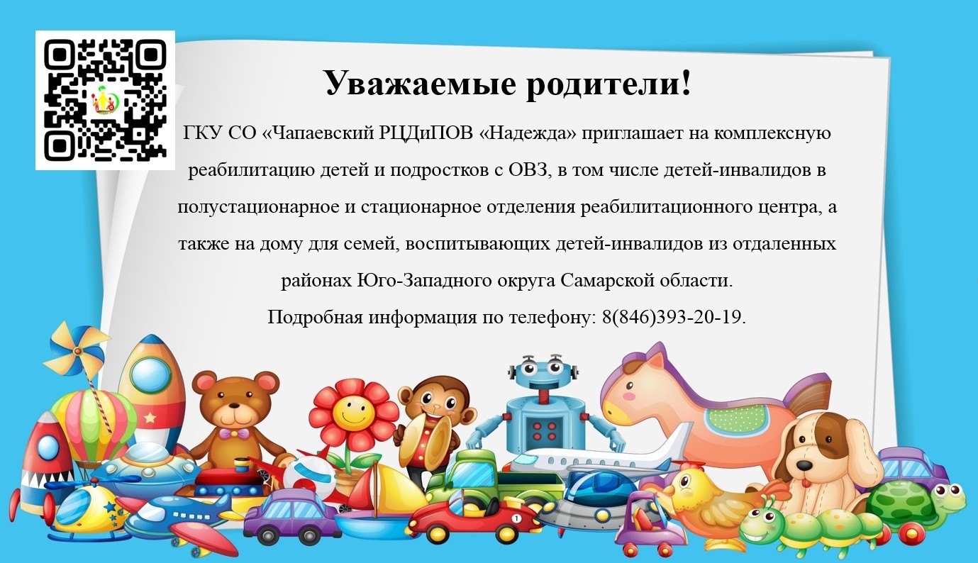 ГУКУ СО "Чапаевский РЦДиПОВ "Надежда" приглашает на комплексную реабилитацию детей и подростков с ОВЗЧтобы оценить условия предоставления услуг используйте QR-код или перейдите по ссылке ниже